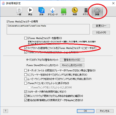 「詳細」をクリックし、「ライブラリへの追加時にファイルを[iTunes Media]フォルダーにコピーする」の欄にチェックをします。