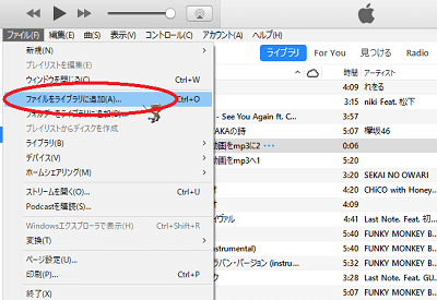 「ファイル」をクリックし、「ファイルをライブラリに追加」を選択、取り込みたい音楽ファイルを選択します。
