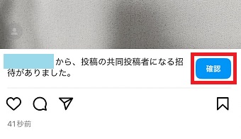 「○○から、投稿の共同投稿者になる招待がありました。」が開いたら「確認」をタップします。