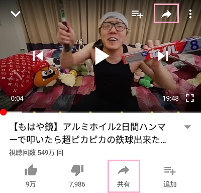 動画を再生すると、画面の上部と動画タイトルの下部に「共有」ボタンが表示されます。これをタップしましょう。