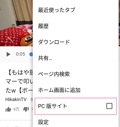 また、Chromeのメニューボタンから「PC版サイト」のチェックボックスをオンにすることで、モバイル版サイトではなくPC版WEBサイトへアクセスすることができます。