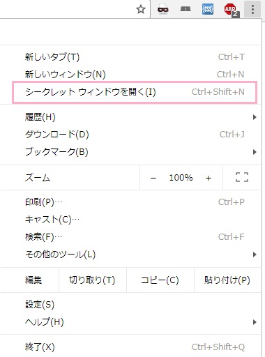 ブラウザの右上にあるメニューボタンをクリックし、「シークレットウィンドウを開く」をクリックしましょう。