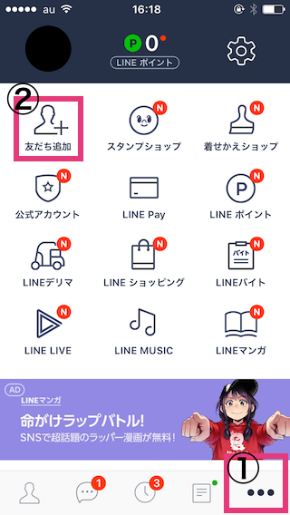 まずは、ホーム画面の「・・・」から「友だち追加」を開いてください。ここまで開くことができたら、幾つかの教え方がありますので、是非以下のお好きな方法からトライしてみてくださいね。