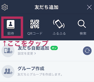 まずは、「友だち追加」画面の一番左の招待をタップします。