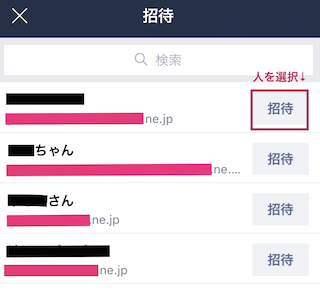 すると、アドレス帳に登録されている連絡先の一覧が出てきますので、右の招待ボタンを押すとその人宛にメールが作成されます。