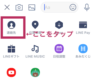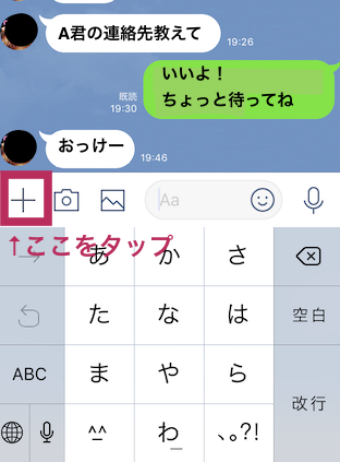 まずは、別アカウントを教えたい友達のトーク画面を開きます。その後、コメントを入れる箇所の一番左の「+」をタップします。