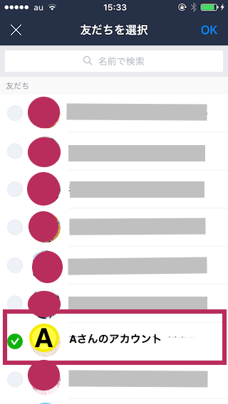LINEに登録されている友達が表示されたら、該当の友達を選択します。チェックマークがついたら、右上の「OK」をタップします。