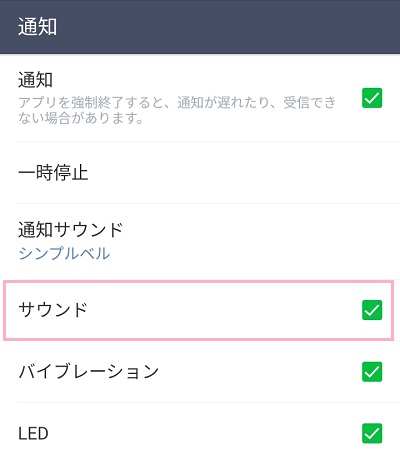 「通知」のチェックボックスがオンになっている場合でも、「サウンド」のチェックボックスがオフになっている場合は当然通知音は鳴りません。「サウンド」をタップしてチェックボックスをオンにしましょう。