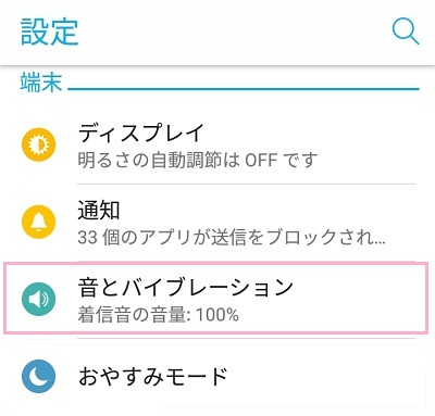 マナーモードを解除しても通知音が鳴らない場合は、通知音のボリュームをチェックしてみましょう。設定メニューの「音とバイブレーション」をタップします。