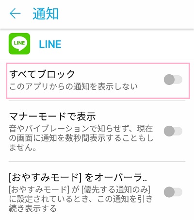 詳細項目にある「すべてブロック」がオンになっている場合は、LINEアプリ側で通知をオンにしていても実際に通知されることはありません。