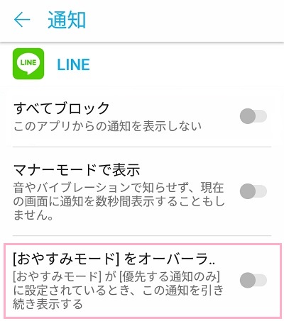 「[おやすみモード]をオーバーライドする」の項目をオンにすれば、おやすみモード時にもLINEの通知音が鳴るようになります。