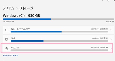ストレージの項目一覧が表示されます。上部にストレージの使用状況がグラフ化されて表示されるので、「一時ファイル」のグラフをクリックしましょう。