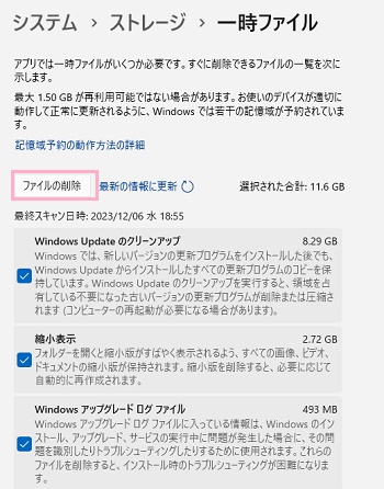 「一時ファイル」の項目一覧が表示されます。「Windows Updateのクリーンアップ」・「縮小表示」・「Windowsアップグレードログファイル」など様々な一時ファイルが選択された状態になっているので、「ファイルを削除」ボタンをクリックしましょう。これで、一時ファイルを削除することができますよ。もし削除したくない一時ファイルがある場合は、対象のチェックボックスをクリックしてオフにしておきましょう。基本的に、「Windows Updateのクリーンアップ」や「Windowsアップグレードログファイル」などの項目が容量の大きいファイルであることが多いです。ですので、これらを削除することでストレージの空き容量を増やすことができますよ。