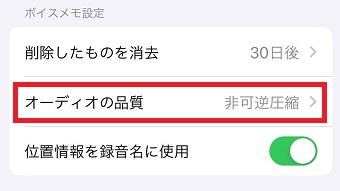 ボイスメモの音質には「非可逆圧縮」方式と「ロスレス圧縮」方式があります。デフォルトでは「非可逆圧縮」方式になっています。