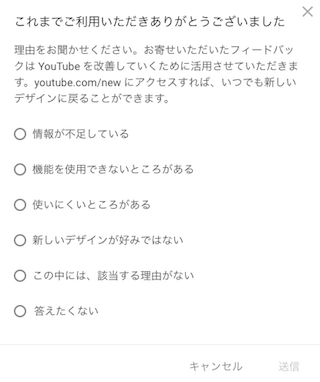 デザインを戻す理由を選択するのと、再び新デザインに戻すときは「youtube.com/new」にアクセスすればいいという内容となっています。