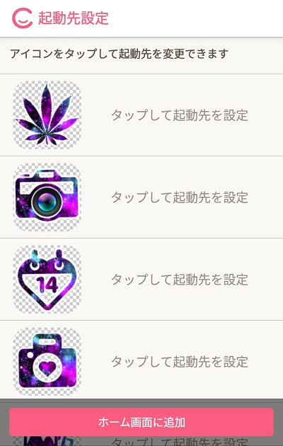 アイコン一覧が表示されるので、タップして起動するアプリを選択しましょう。アプリの設定が終わったら、「ホーム画面に追加」をタップしましょう。