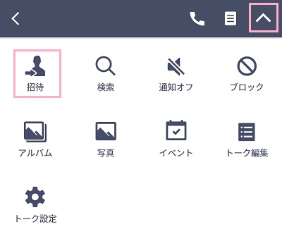 友だちとのトーク画面の右上にあるメニューボタンをタップし、表示されたメニューの中から「招待」をタップしましょう。