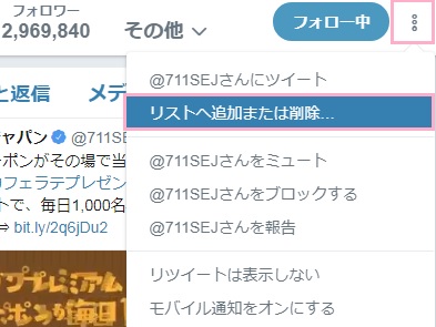 まずはリスインしたいユーザーのプロフィールページに移動し、フォローボタンの横にあるメニューボタン(丸が3つ連なったマーク)をクリックして「リストへ追加または削除」をクリックします。
