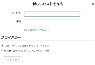 「新しいリストを作成」ウィンドウが表示されるので、リスト名・リストの説明を入力し、リストを公開するかどうかを選択したら「リストを保存」をクリックすればリストが作成されます。
