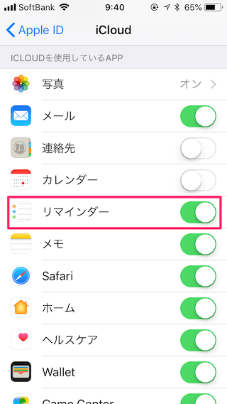 「iCloudを使用しているAPPの設定」画面となりますので、リマインダーの設定をONにします。