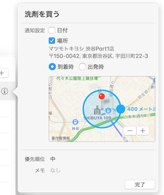リマインダーアプリでは、場所を指定してタスクを通知させることもできます。あるエリアに到着、あるいは出発するときにタスクをリマインドさせます。