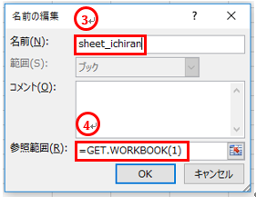 表示された「名前の編集」ダイアログの赤枠③に「sheet_ichiran」を入力し、赤枠④に「=GET.WORKBOOK(1)」を入力します。