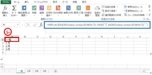 シートの表示させたい箇所を選択し、「=REPLACE(INDEX(sheet_ichiran,ROW(A1)),1,FIND("]",INDEX(sheet_ichiran,ROW(A1))),"")」と入力します。