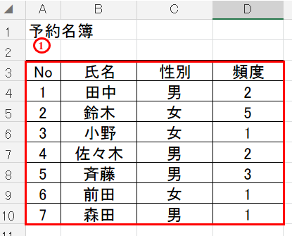 先程の例で、Excelで「予約名簿」の一覧表を使用します。図のとおり、「予約名簿」の一覧表から、「No」、「氏名」、「性別」、「頻度」という項目ごとに整理されたデータがあります。今回は、「予約名簿」の一覧表の「性別」の項目からCOUNTIF関数を使用して「男性の数」と「女性の数」をそれぞれ抽出し、人数を表示させてみたいと思います。