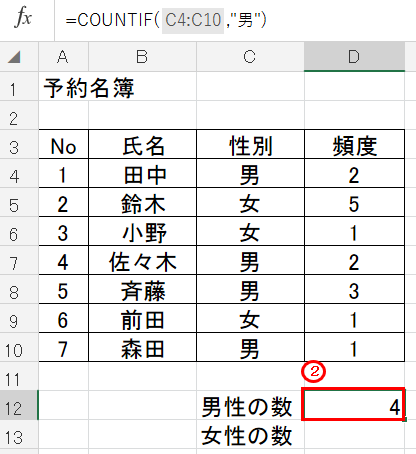 赤枠②セル「D12」には「=COUNTIF(C4:C10,"男")」と入力されています。