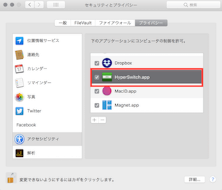 「HyperSwitch」にアクセス許可をするために左下の南京錠のアイコンをクリックします。
