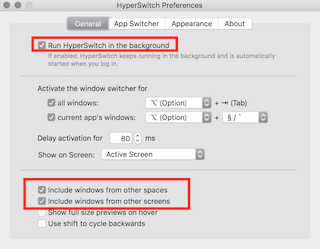 「Include windows from other spaces」と「Include windows from other screen」の2箇所にチェックを入れ、仮想デスクトップとマルチディスプレイに表示されているウィンドウの表示を許可します。