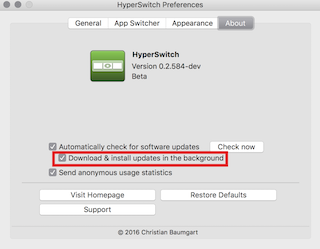 Aboutの項目では「Download & install updates in the background」にチェックを入れるとバックグラウンドでHyperSwitchのアップデートとインストールを行うようになります。