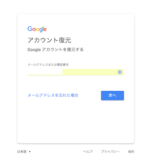 上記リンクをクリックするとこちらのアカウント復元のページが開きます。