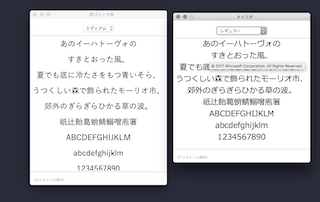 こちらも游ゴシックの方がヒラギノよりも幅が狭く文字が細いためかすっきりした印象を受けます。