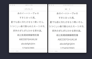 ヒラギノの方が幅が狭くすっきりとした印象を受けます。