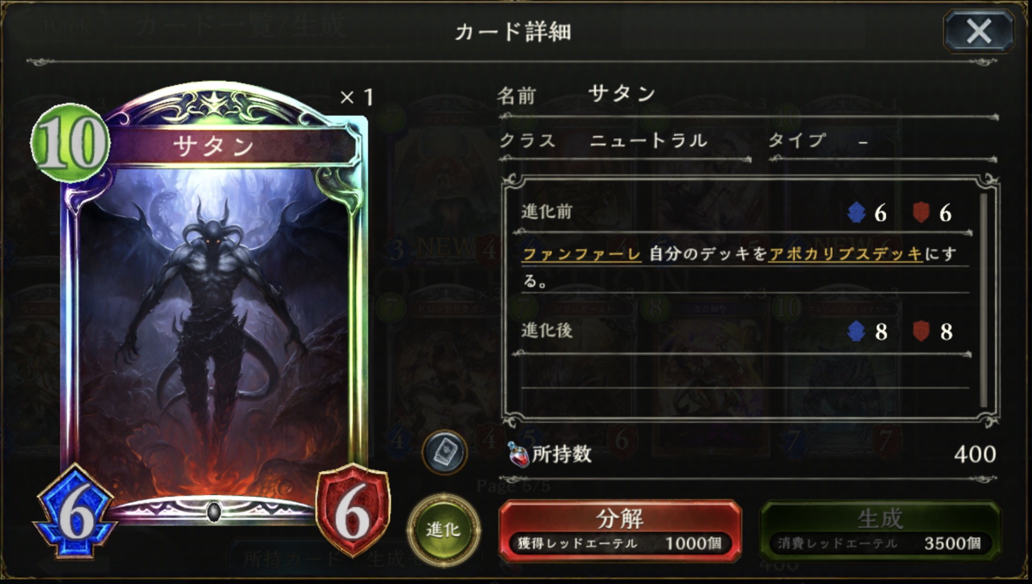 カード1つ1つ見ても奥が深いこのゲームですが、 低コストだと弱い反面使いやすい部分があり、 攻撃力も強いと高コストで体力が低かったりと その逆で体力が多いと攻撃力が弱いなど、 なかなかバランスの取れたカードを選出するのは かなり悩みますが、進化させるための条件で、 必ず持っていなければいけないカードなどもあるので、 その特徴を抑えるのも重要です。 各カードの詳細はメインメニューの『カード』で 見ることが出来ますので、そこで新しい発見をしてみて下さい。 最後にこちらが参考のカードの詳細です。