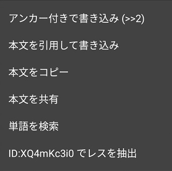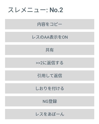 メニューボタンをタップすることで書き込みやスレッドのお気に入り登録が行えます。