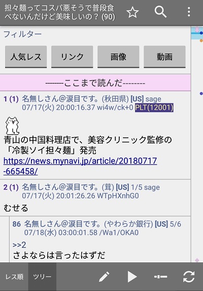 画面下部のツールバーはデフォルトでは左から「レス順表示」「ツリー表示」「書き込み」「自動スクロール」「リストコントローラー」「更新」となっており、ツールバー設定でカスタマイズすることができます。