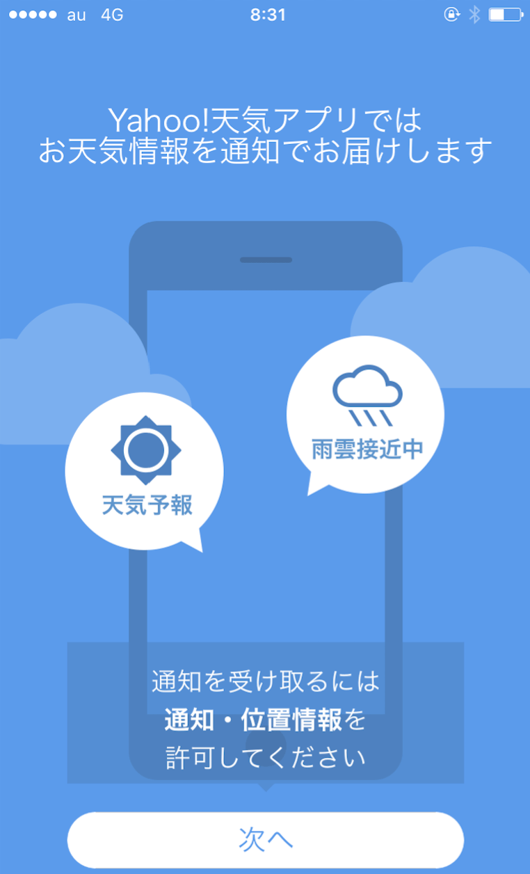 起動するとチュートリアルがはじまります。「次へ」のボタンをタップして進みましょう。