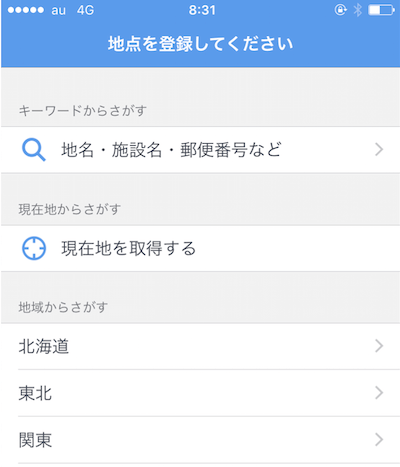 次に地点登録を求められます。アプリではここで登録した地点の天気情報が表示されますので、自分の現在地の地点を登録しましょう。