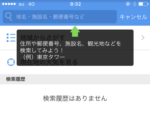 特定の地点の天気情報を検索することができます。これから行く旅行先などの地点の天気を知りたいときに利用します。 検索窓に地点の「住所」「郵便番号」「施設名」「観光地の名称」などを入れることで利用することができます。