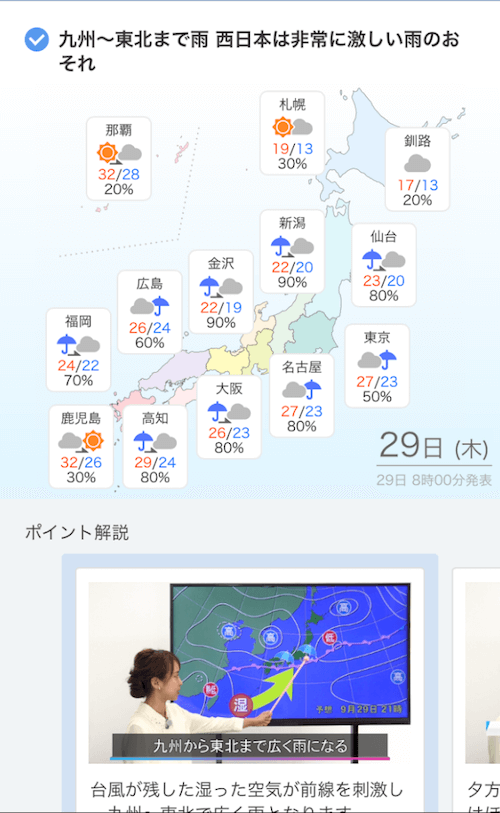 またポイントの解説があり、テレビの天気予報さながらお天気おねえさんの全国の天気についての解説を見ることができます。このポイントの解説は動画で見ることもでき、またSNSへのシェアをすることもできます。 週間天気の箇所では東日本、西日本に分かれておりそれぞれの都市の1週間の天気・気温・降水確率を確認することができます。