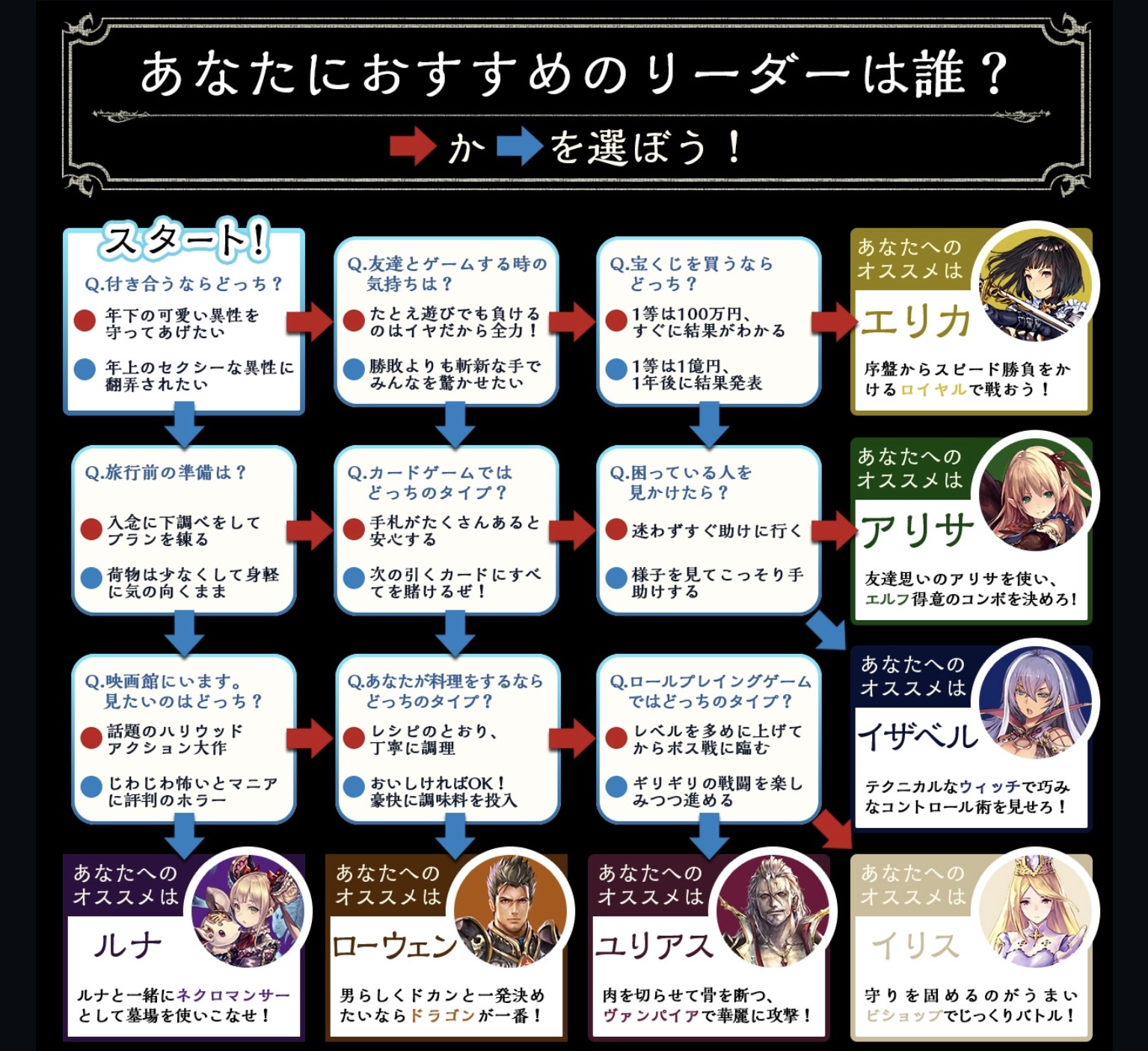 なんとも斬新な選び方ですが、 優柔不断な方には背中を押してくれるようなページです。 せっかく大事なチケットを消費し、 勝負を試みたけど、結果がボロボロとう時に 一度こちらで、今極めようとしている リーダー(クラス)が自分に合っているか? もう一度見定めてみてはいかがでしょうか?
