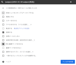 あとは複数条件の検索結果を見てみて、問題なければ、合致する結果に対する操作を指定してフィルタを作成するだけです。