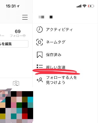 するといくつかの項目が出てきます。この中に、『親しい友達』というところがあるのがわかります。(ちなみにこれらの項目は、プロフィールページを左にスワイプすることでも表示できます!)