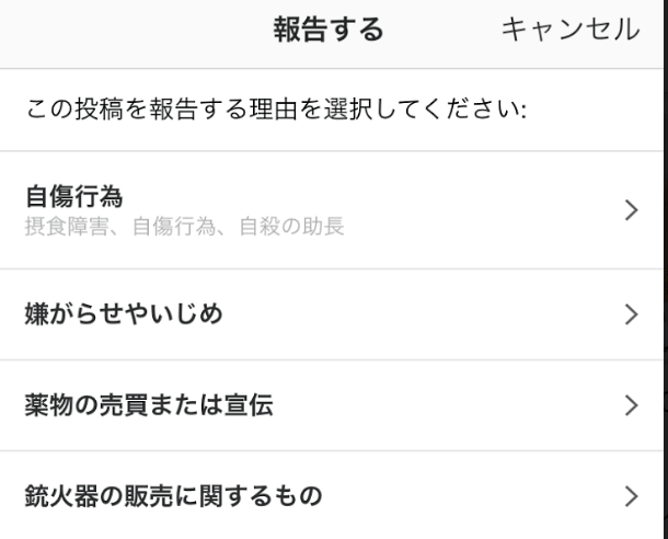 「自傷行為」「嫌がらせやいじめ」「薬物の売買または宣伝」「銃火器の販売に関するもの」などいくつか選択しがあり、その中の「自傷行為」を選択することで当事者に対してサポートされる仕組みのようです。