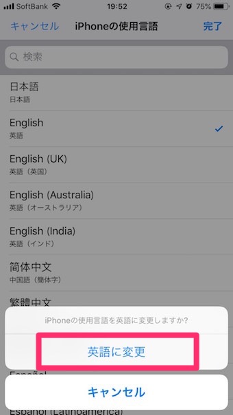 「完了」をタップした直後に、「iPhoneの使用言語を英語に変更しますか?」と言う最終確認が入ります。設定状況を確認の上、英語で設定する場合は「英語に変更」を押し、日本語から英語に言語設定完了です。