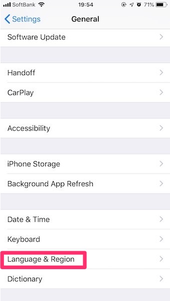 続いてグレーで区切られたところを1ブロックとして数え、5ブロック目にある「iLanguage&Region」をタップします。これが「言語環境」にあたります。