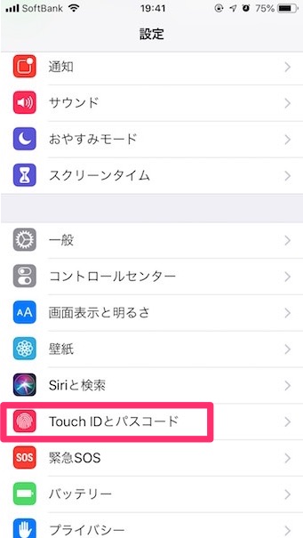 続いて設定の下の方にある「Touch IDとパスワード」をタップ。