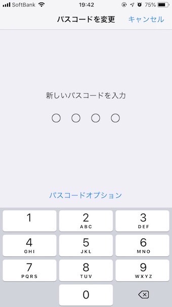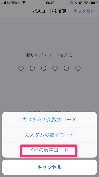 すると「パスコードオプション」という青文字が表示されるのでタップし、「4桁の数字コード」をタップします。